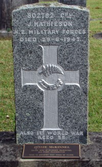 John Matheson died in June 1947 aged 55 or 56 and is buried in Onerahi cemetery in Whangarei. The designated dates for a death resulting from active service in WW2 to be counted as a war death are from 3 September 1939 to 31 December 1947. The inclusion of John Mathieson in the official tally indicates that he died as a result of as injuries or illness incurred while on active service.